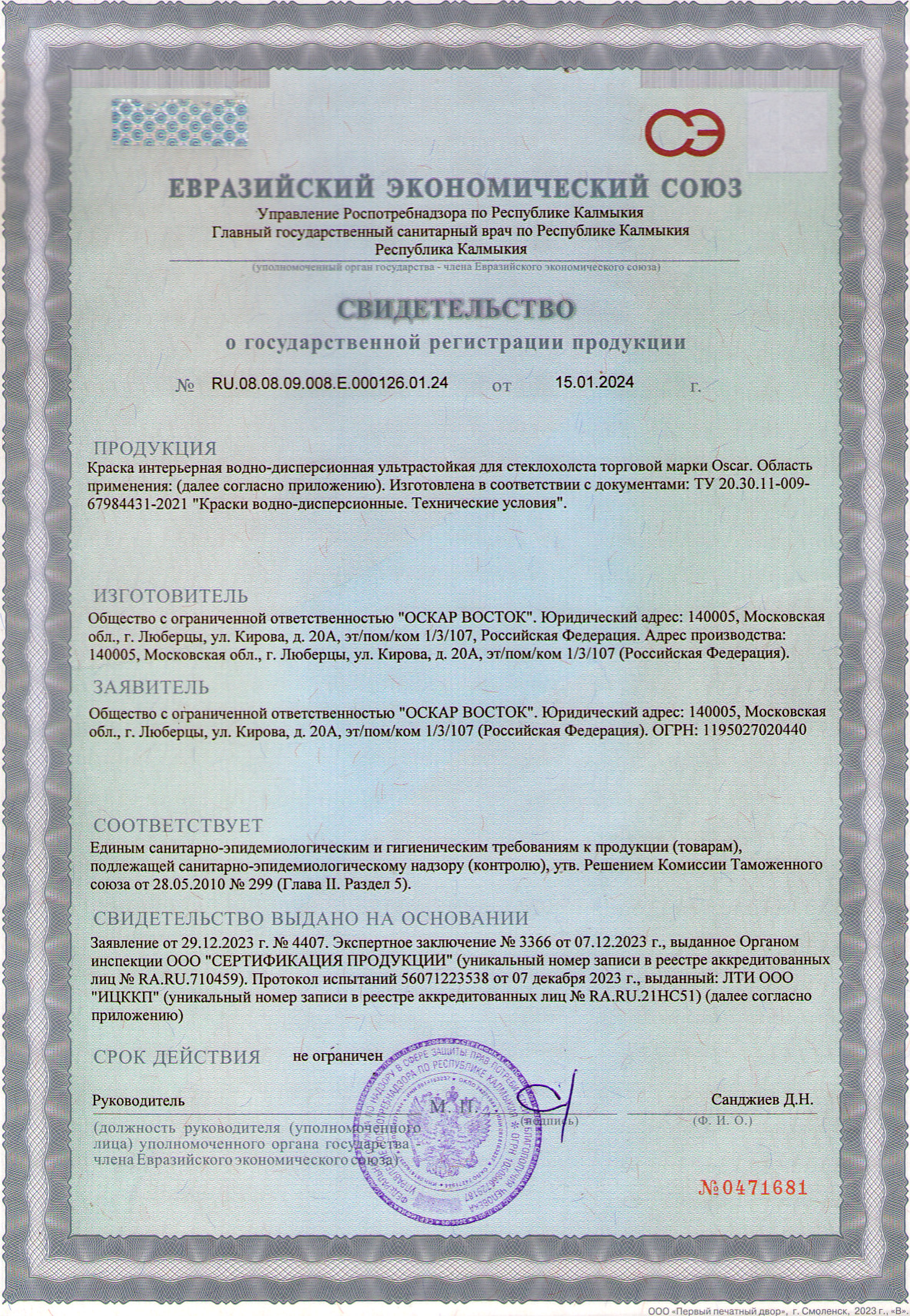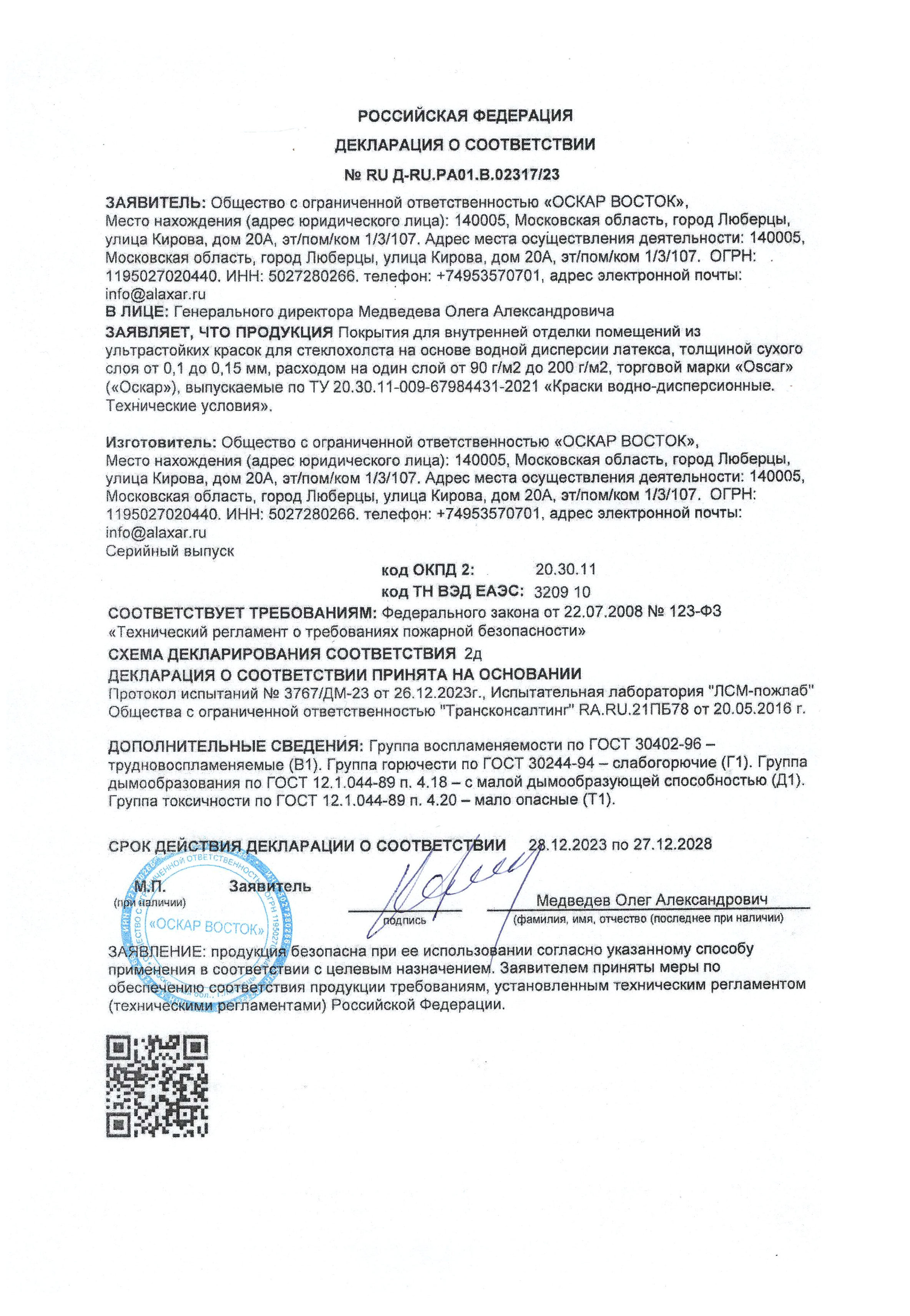 Как и любой продукт, подлежащий сертификации, наша ультрастойкая латексная краска для стеклохолста Oscar® полностью сертифицирован для продажи и использования в Российской Федерации. Экологическая безопасность краски Oscar® зафиксирована в Свидетельстве о государственной регистрации продукции. Пожарная безопасность краски Oscar® гарантирована Декларацией о соответствии требованиям технического регламента. Кроме этого краска Oscar® протестирована на определение срока службы лакокрасочного покрытия.