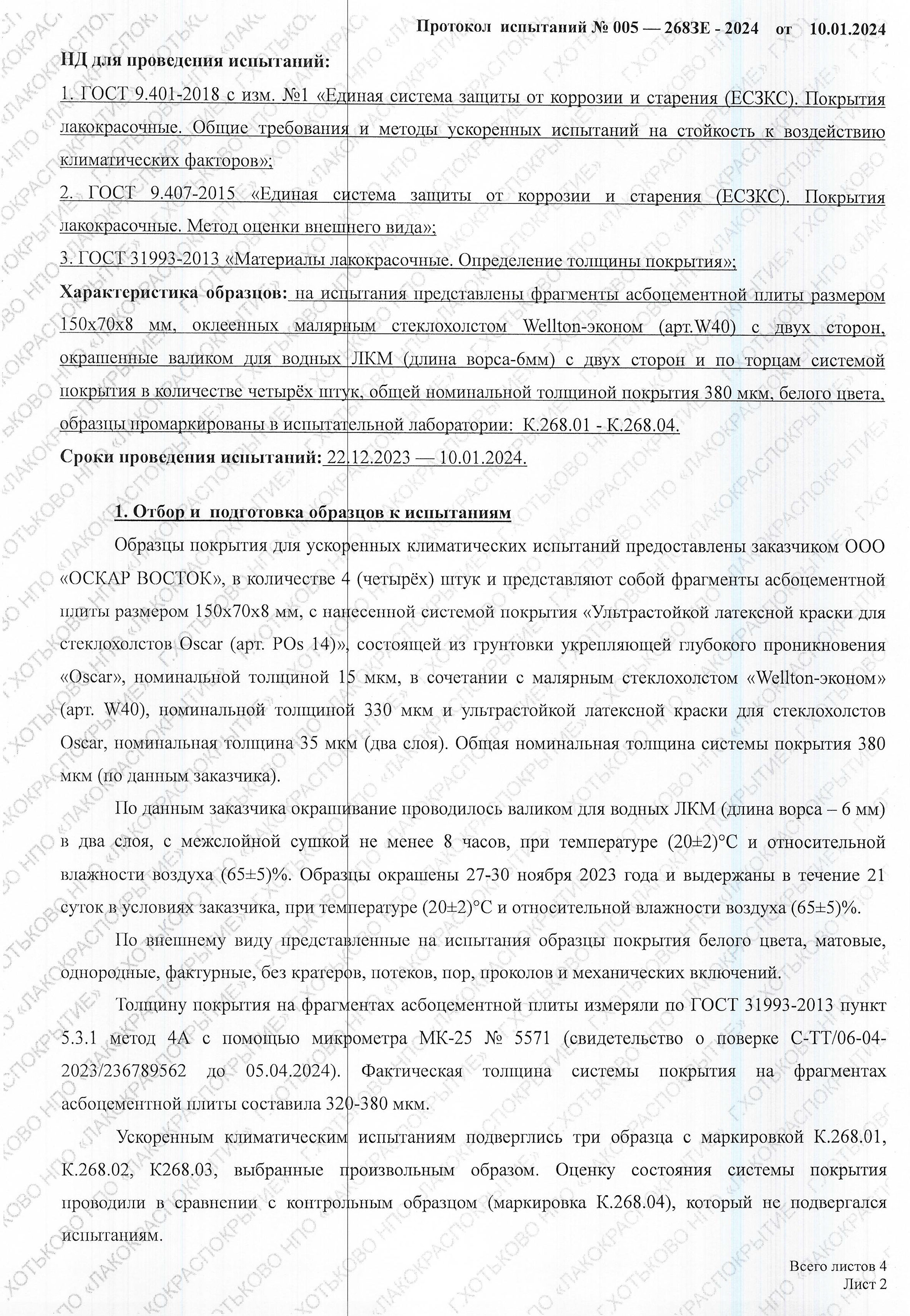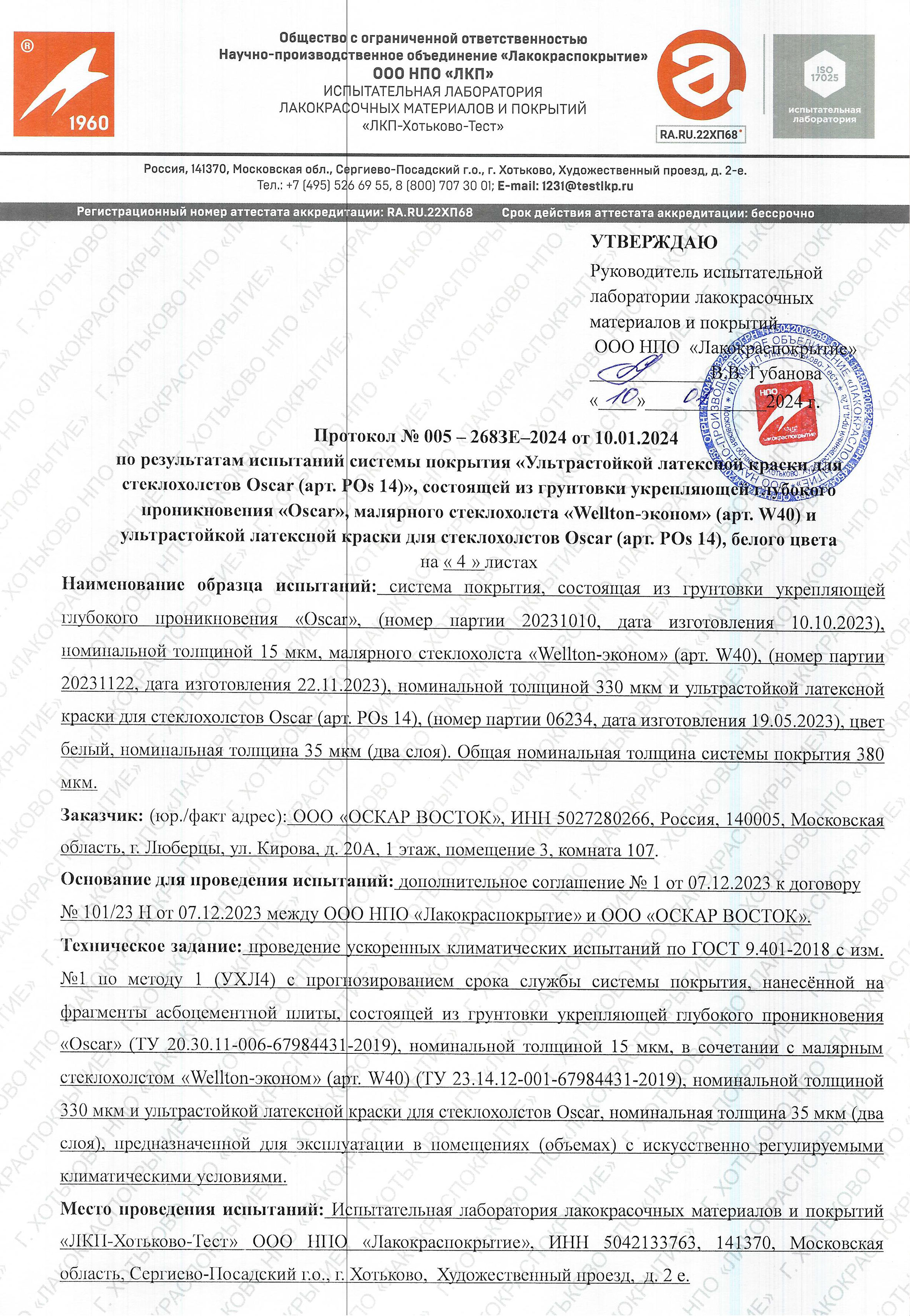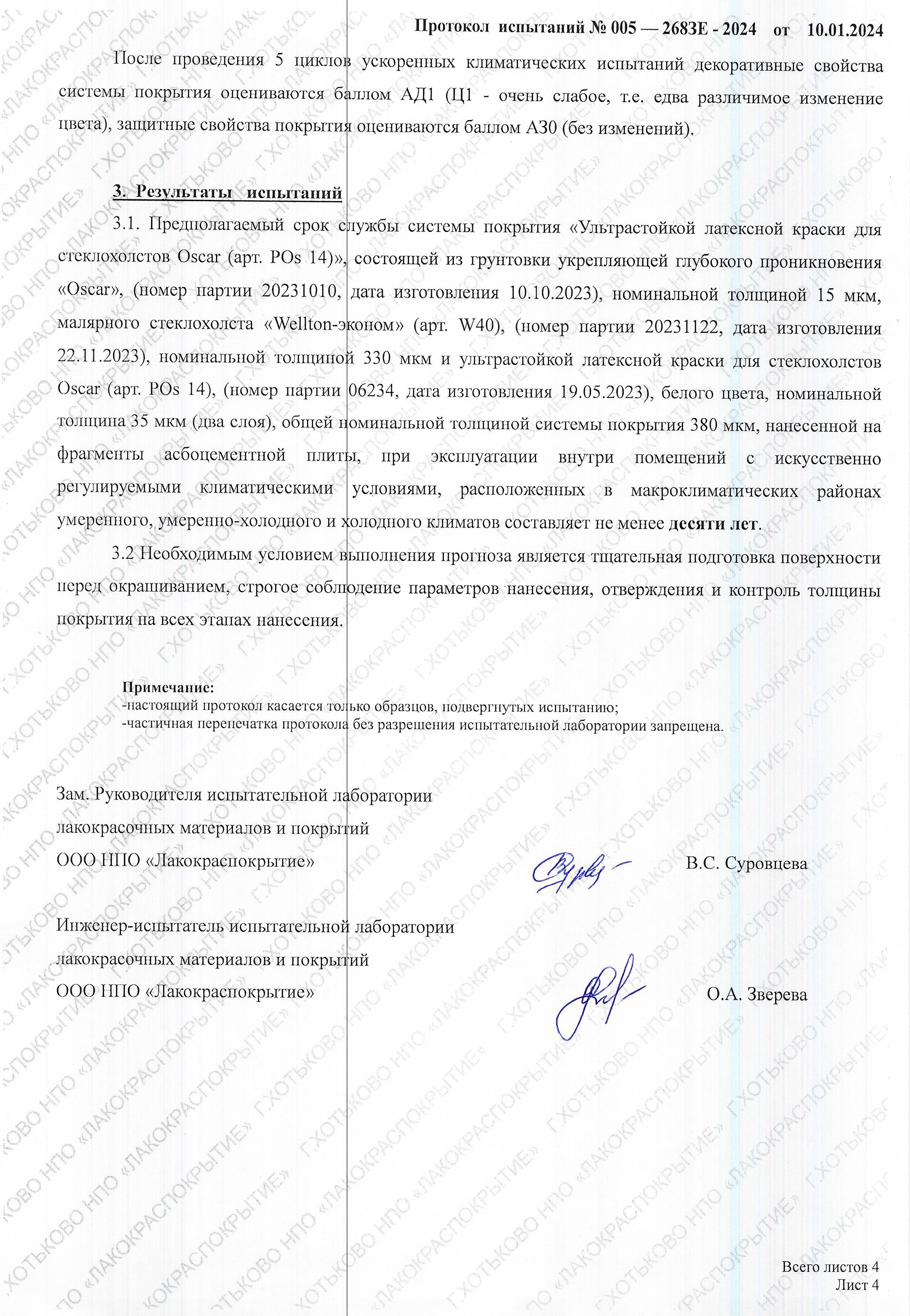 Проведённые в испытательной лаборатории лакокрасочных материалов и покрытий ООО НПО «Лакокраспокрытие» исследования доказали, что срок службы покрытия, выполненного при помощи нашей ультрастойкой латексной краски для стеклохолста Oscar®, при эксплуатации внутри помещений с искусственно регулируемыми климатическими условиями, расположенных в макроклиматических районах умеренного, умеренно-холодного и холодного климатов, составляет не менее 10 лет!